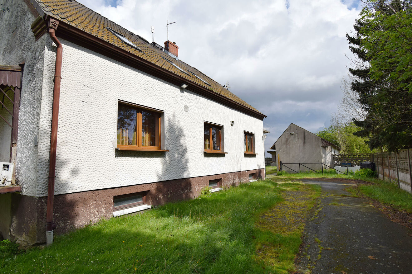 Obszar zabudowań obejmujący dom o powierzchni ok. 220 m2, zabudowania gospodarcze w postaci wielostanowiskowego garażu mogące służyć jako warsztat (ok. 205 m2) oraz dodatkowy budynek z dwoma pomieszczeniami garażowymi i dodatkowym warsztatem (całość ok. 100 m2) wraz ze sporym obszarem zieleni wokół ogrodzone betonowym płotem.